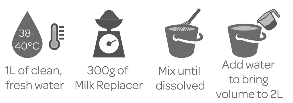 Add MaxCare Piglet Milk Replacer to half the required volume of fresh, clean water at 38 to 40°C. Mix until fully dissolved. Add water to required volume. Example: If mixing 2 litres – add 1 litre of water into mixing container, add 300 grams of MaxCare Piglet Milk Replacer, mix until dissolved, then add water to make mix up to 2 litres in total.
